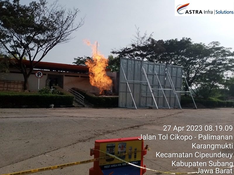 STRA Infra Toll Road Cikopo Palimanan) menyatakan hingga saat ini semburan api di rest area KM 86 B yang masih menyala.